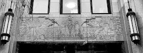 You can quite see one masonic symbol in blue at the top right corner. The same symbol is also on both pillars on the front side. What are they doing in a building with no windows ?